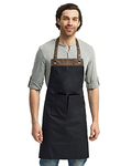 6 oz., 65% polyester, 35% cotton twill; 100% polyurethane trim; Faux leather trim with 2 large eyelets ; Adjustable neckband with press studs; Two bellow-style pockets: 6.5"l x 10"w; 32" L x 28" W;